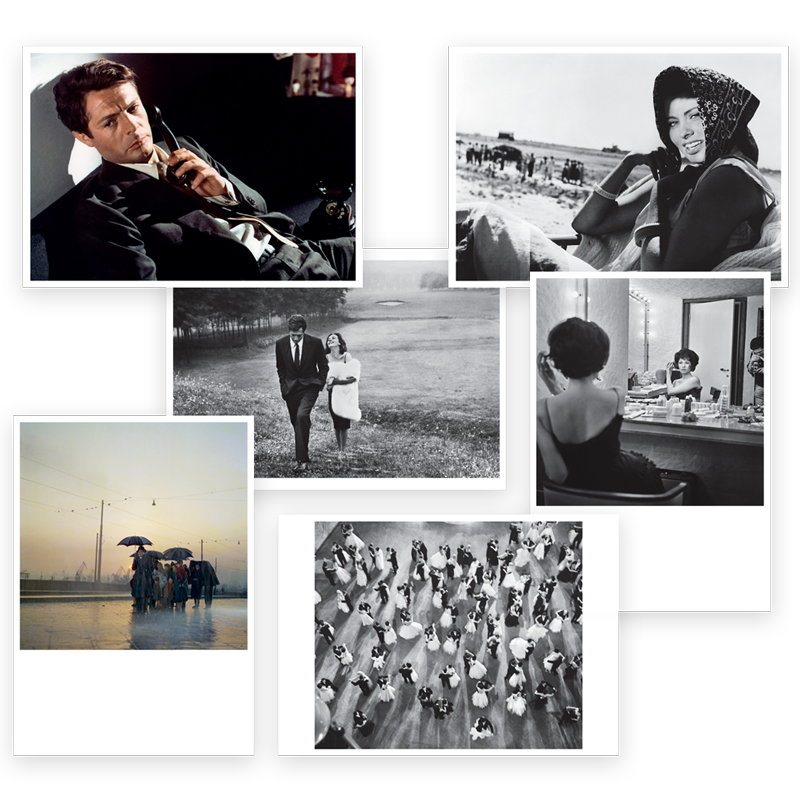 Monica Vitti, Torre Galfa - Milan, 1960; Marcello Mastroianni on the set of La notte by Michelangelo Antonioni, 1960; Sophia Loren on the set of La donna del fiume by Mario Soldati, 1954; Marcello Mastroianni and Jeanne Moreau on the set of La Notte by Michelangelo Antonioni, 1960 © Archivio Sergio Strizzi